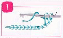 1. Realizar 2 lazadas en la aguja e insertarlaen el 6° punto cadena y manteniendo las lazadas. Sacar hacia adelante.